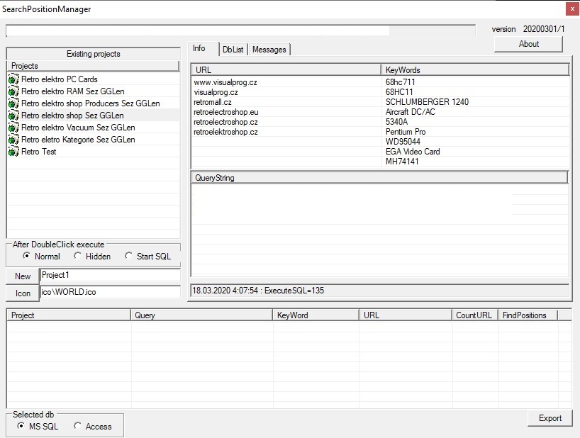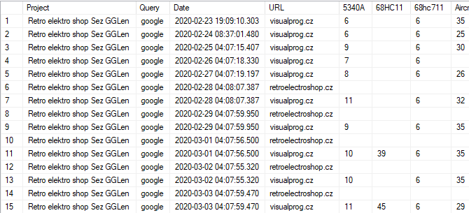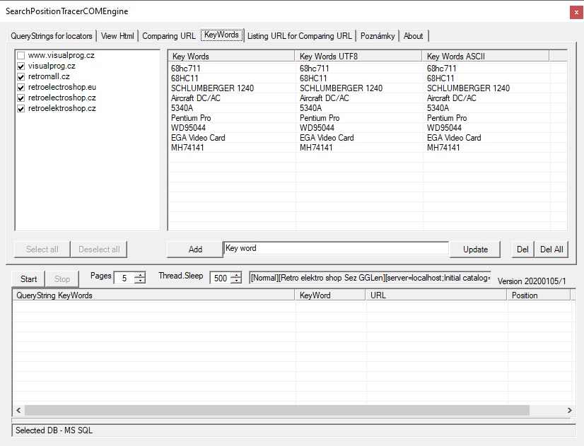 The application searches for the location of the specified keywords in selected search engines (google, seznam.cz) for a given URL. Result is stored in the database.