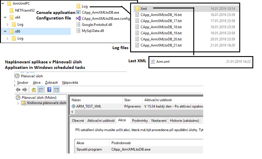 Struktůra adresářů aplikace a její naplánování ve Windows Plánovači úloh. The application directory structure and its scheduling in Windows Task Scheduler. |